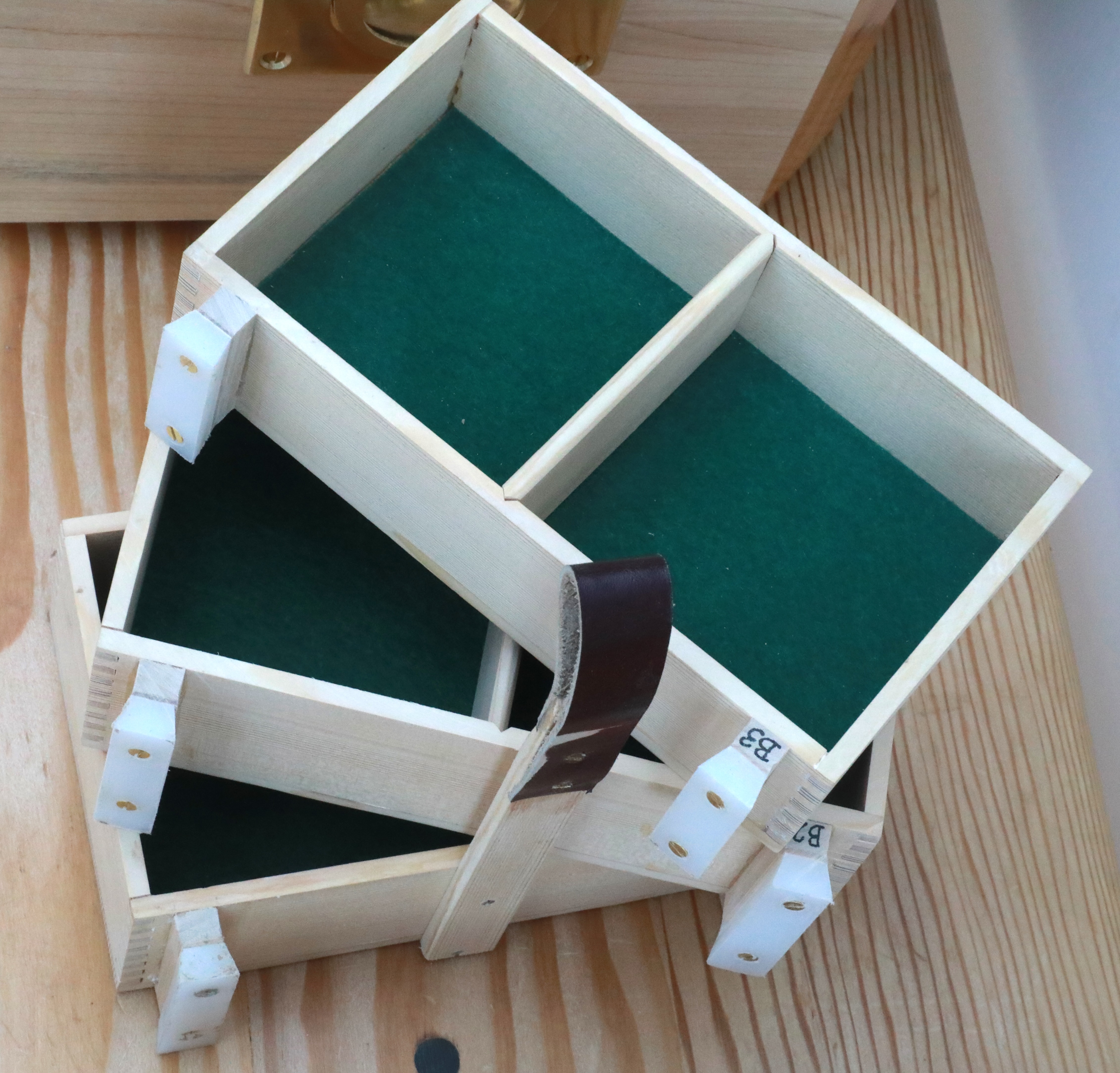 Description: Made of sitke spruce - leftover harpsichord soundboard wood. Showing the fillet plus leather loop fixed to the bottom box that pulls the two upper ones out, and the HDPE runners