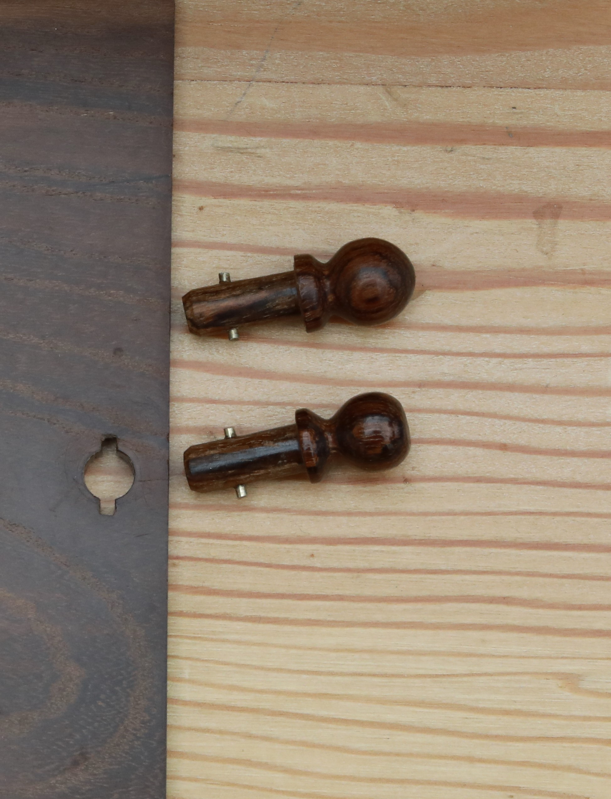 Rudimentary wooden keys which can lock the sliding lid. The small brass rod engages in a slot inside the case when turned through 90 degrees. The second knob on the lid is a dummy, and the second 'key' is a spare. The box is made of laburnum, and the interior tray of mahogany, resting on elm fillets