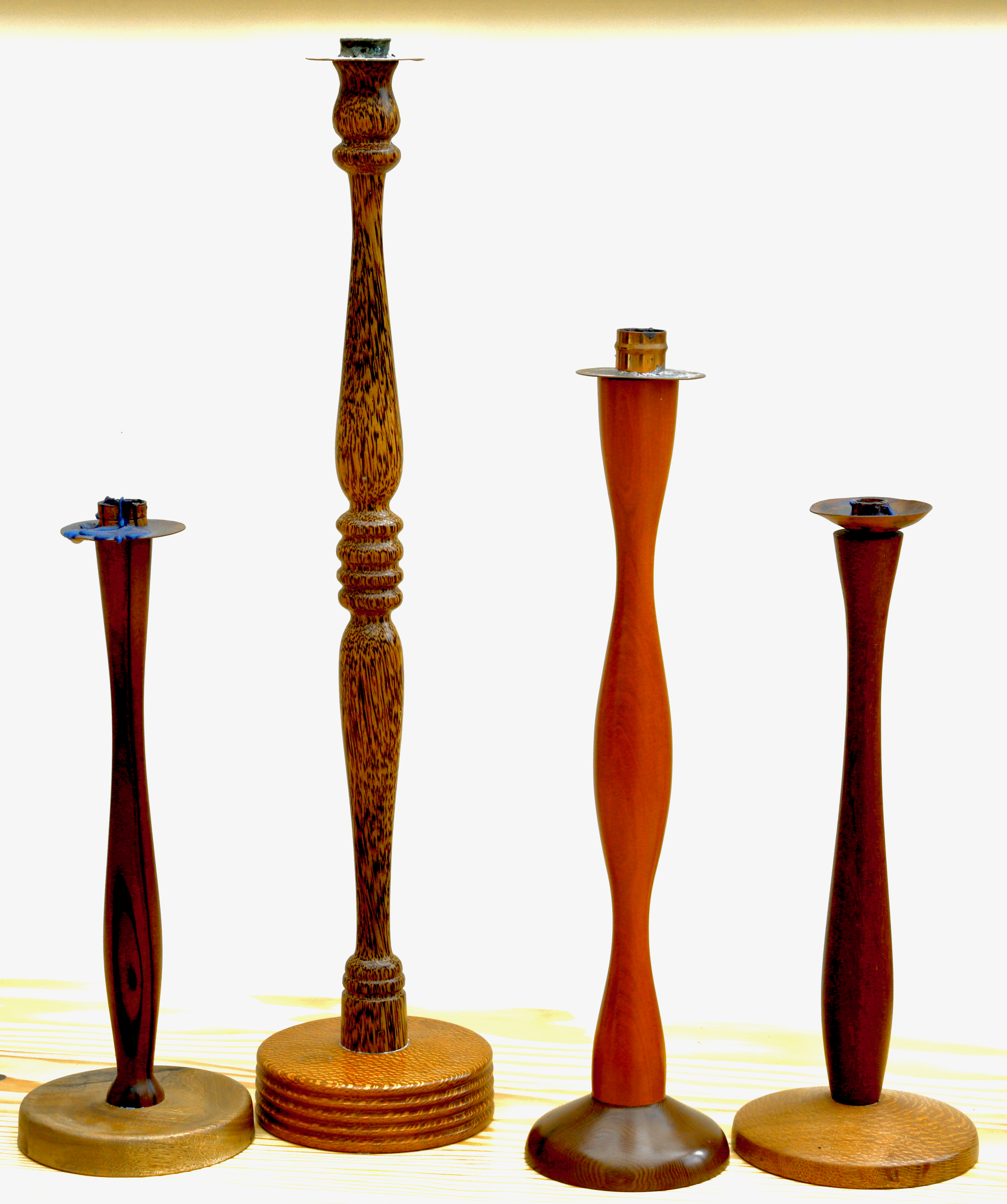 Zebrano & Essex walnut, palmwood and Ropala lacewood, pink ivory and laburnum, and Brazilian rosewood and Ropala. The candleholders are ordinary straight couplers used by plumbers, cut in half and soldered to a copper disk