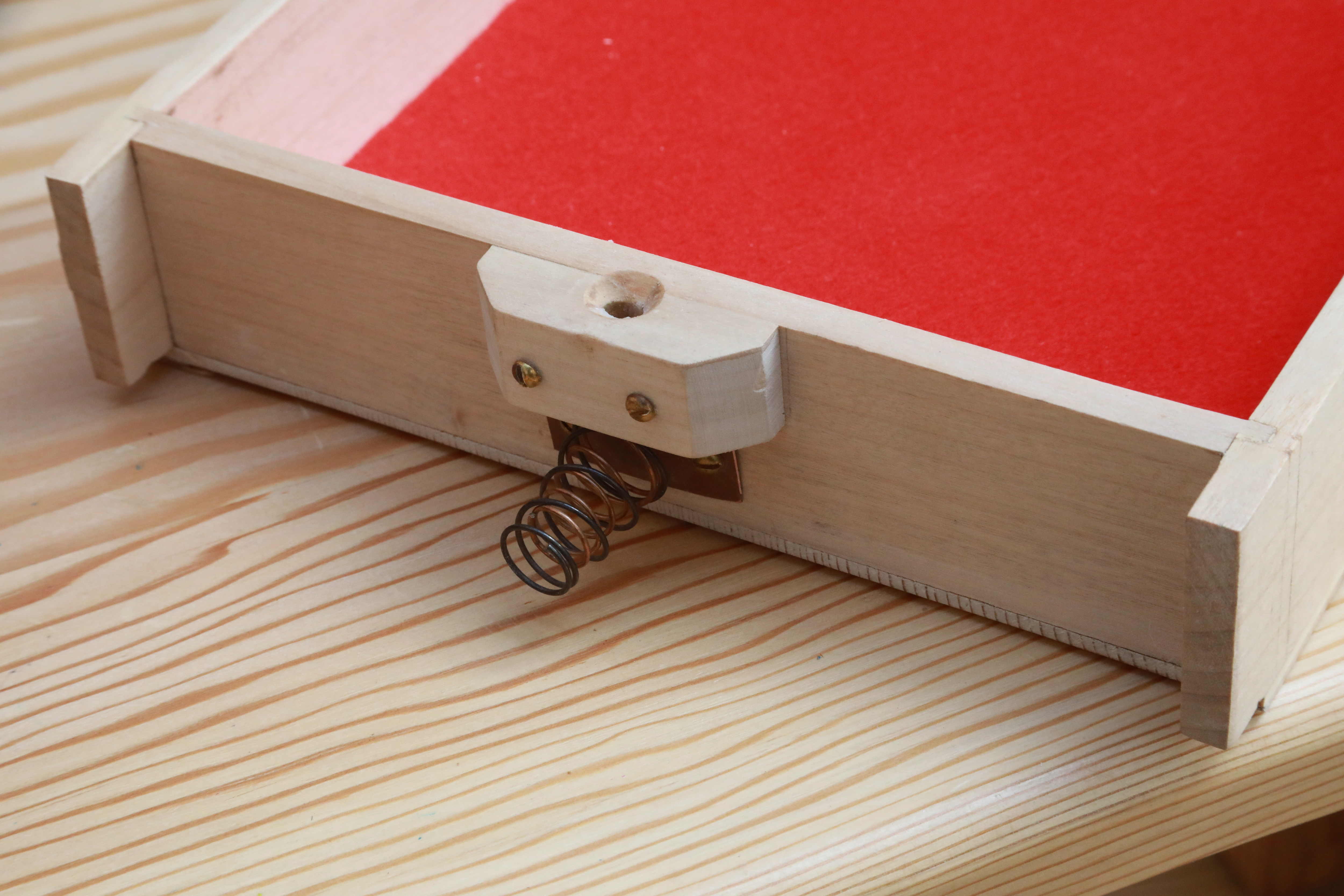 The rounded bottom of the release rod fits into the lug with the chamfered hole, greased with tallow, and this pulls the drawer front tightly in to the side of the box, making it as little visible as possible. I had to make three versions of this lug, with the hole drilled in slightly different places, before selecting the one that did the job best. The double springs attached underneath the lug propels the drawer outwards for a couple of inches when the rod is withdrawn