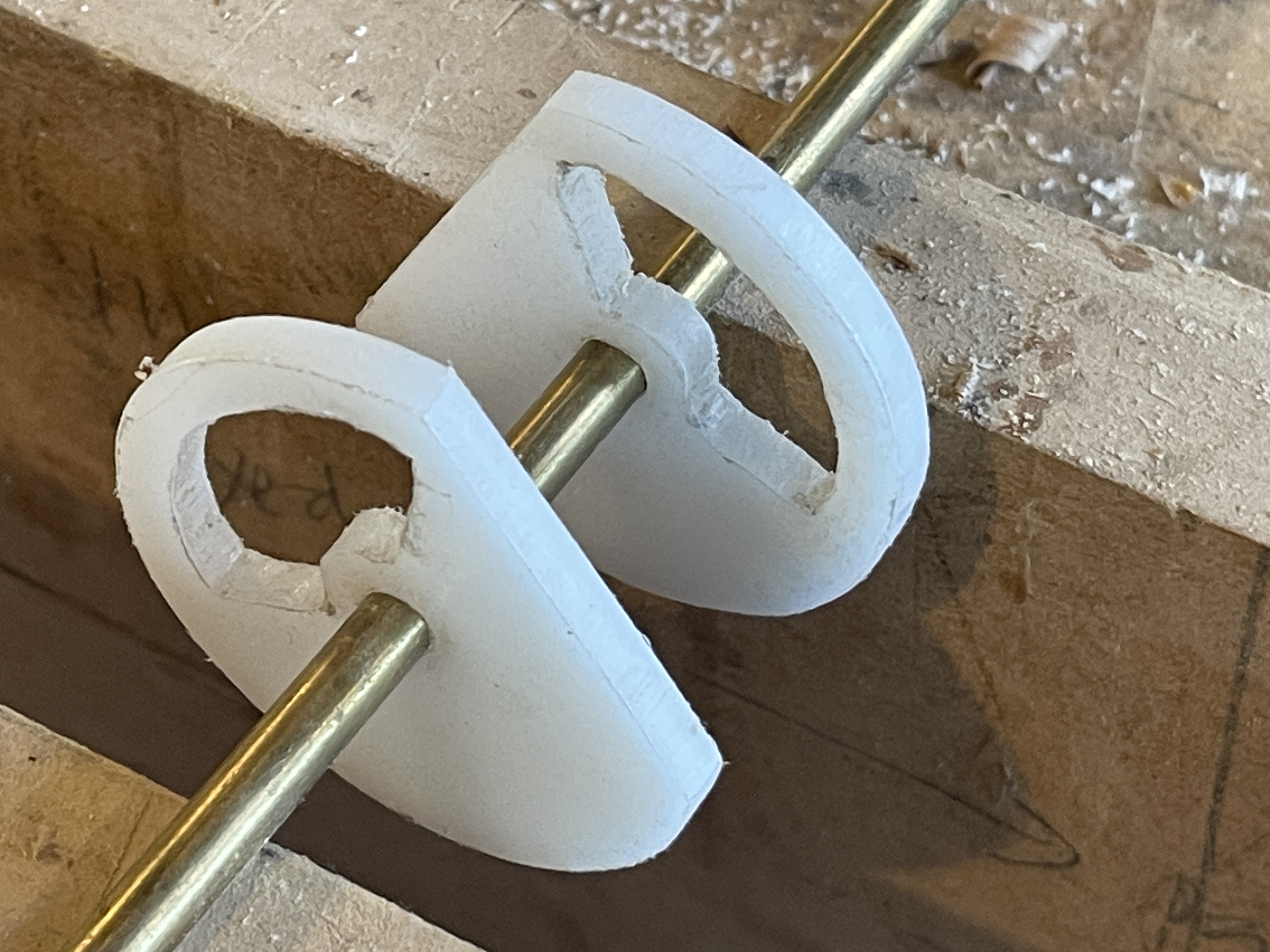 The two pieces of delrin rotate easily around a brass rod. As well as the cutout, which lightens the top quarters, I drilled the bottoms and inserted some lead plugs.