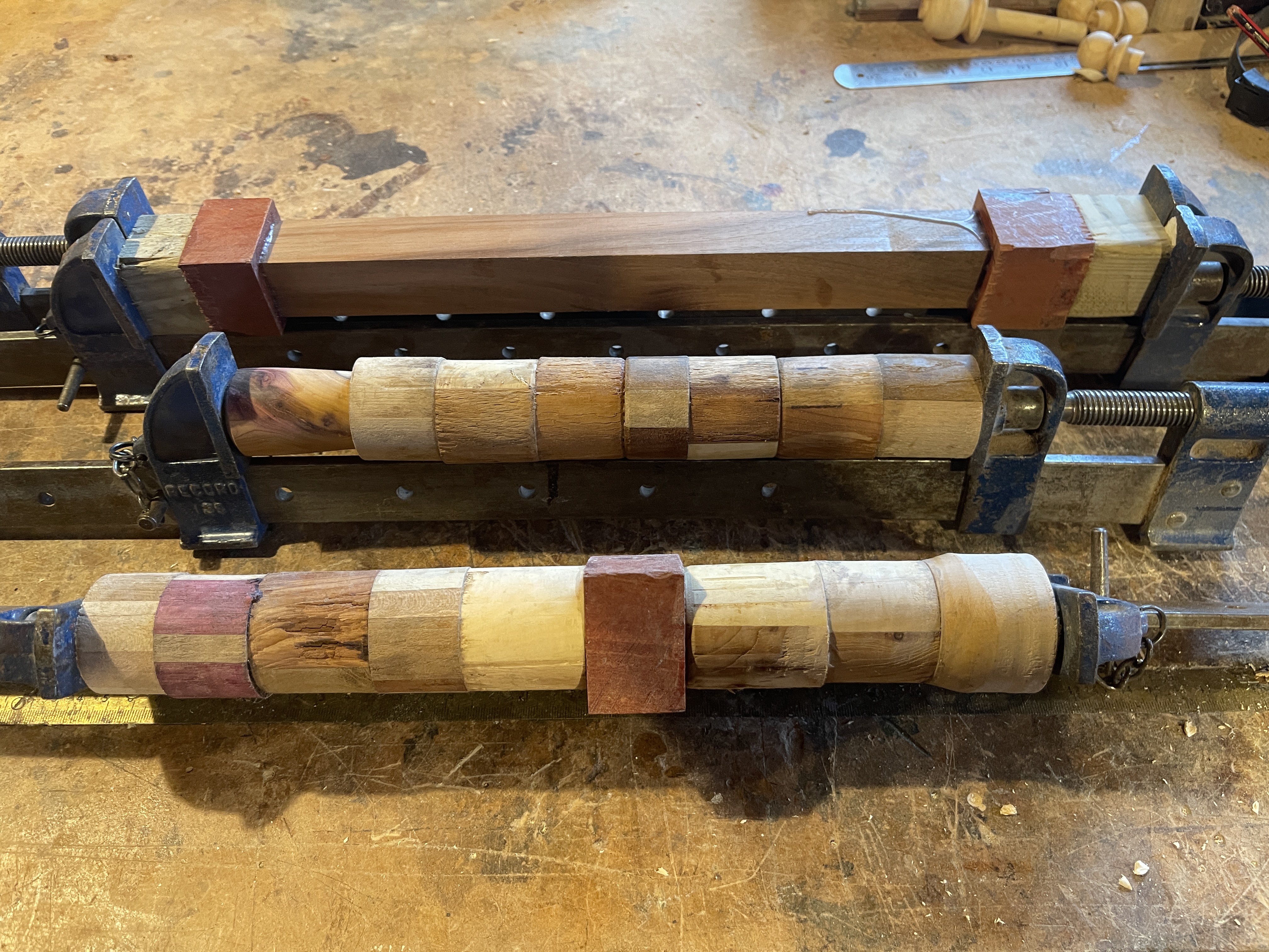 Having received a commission to make wands for our grandchildren I glued different coloured woods together with a central core of steel studding in case they decided to use them as clubs