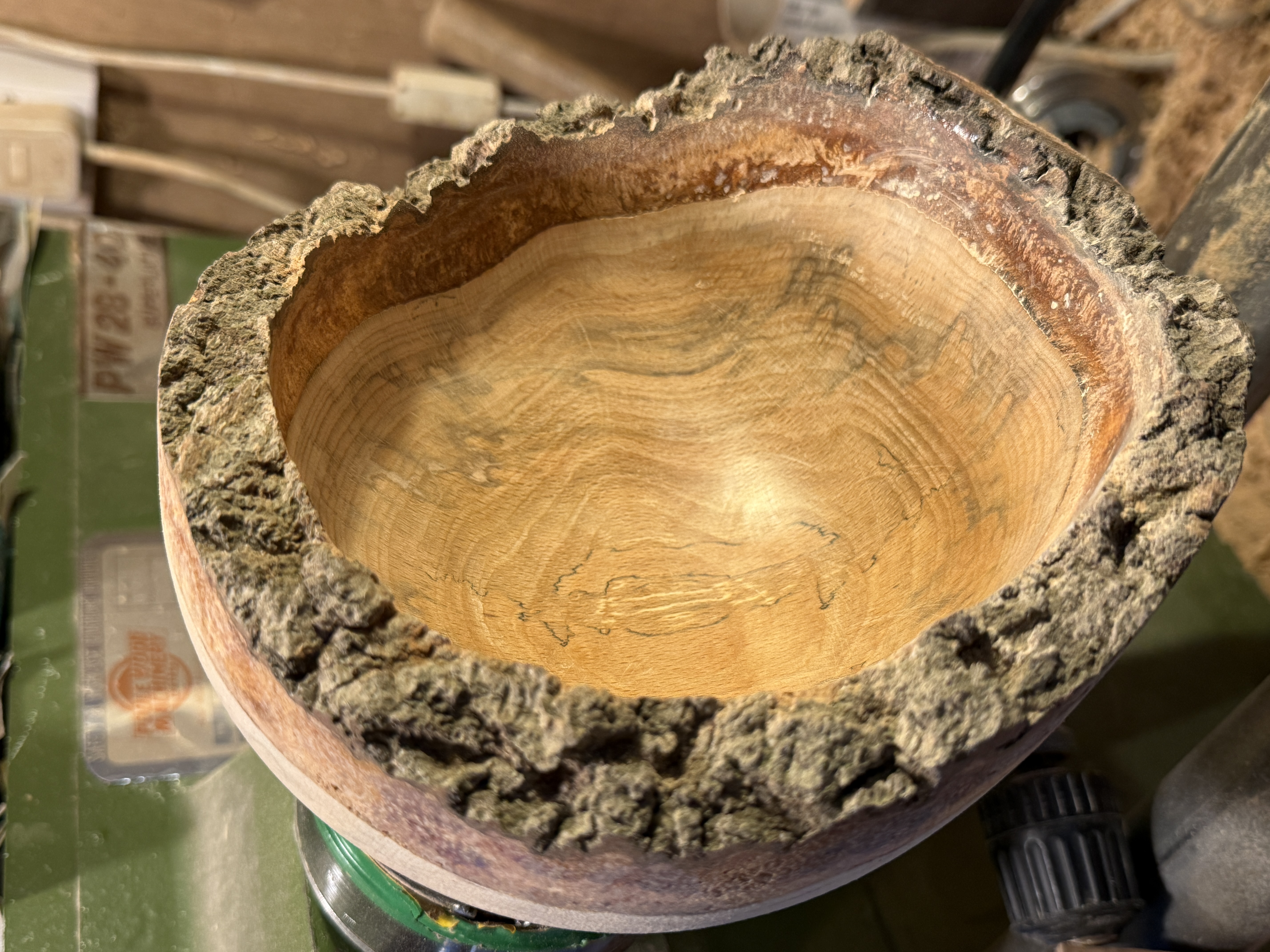 This thickness of bark, already shrinking because the wood is still not seasoned, may eventually seperate from the sapwood; I have tried to arrest the process by using low-viscosity superglue, but wood moves as it wants.
