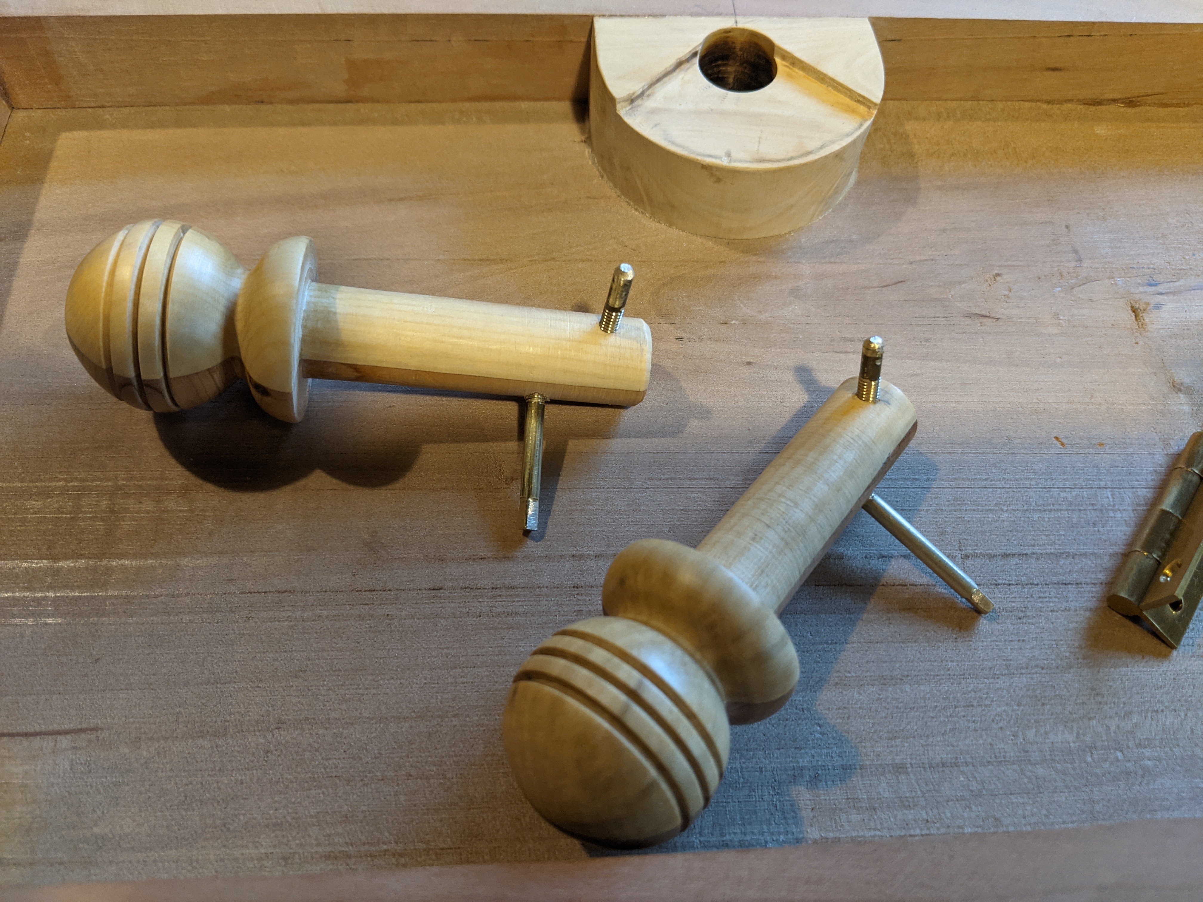 Description: The lower brass peg engages with the inside front of the box to act as a lock, and the longer pin limits travel and ensures that the box part of the knob faces exactly forward when the lid is locked.