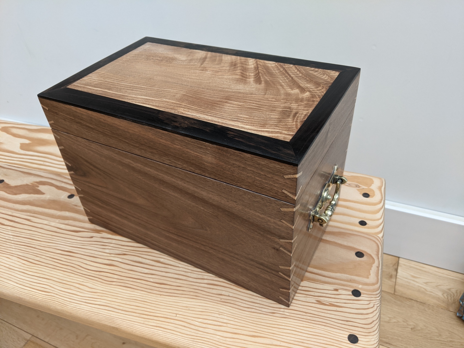 The spoons I made have up to now all been jumbled up in a cutlery drawer, so I decided to make a box for them, tailored to fit the various sizes, using harpsichord soundboard wood (sitka spruce) for the layers of trays. The box case is Essex walnut, and the top is oak and ebony. The grain wraps around the four sides, although the front of the right side doesn't match the right side of the front, because the plank wasn't thick enough to split down the middle. A pair of Edwardian chest handles were needed because the box is quite heavy when full. This was recorded before I made and fitted a catch for the lid - see the following photos