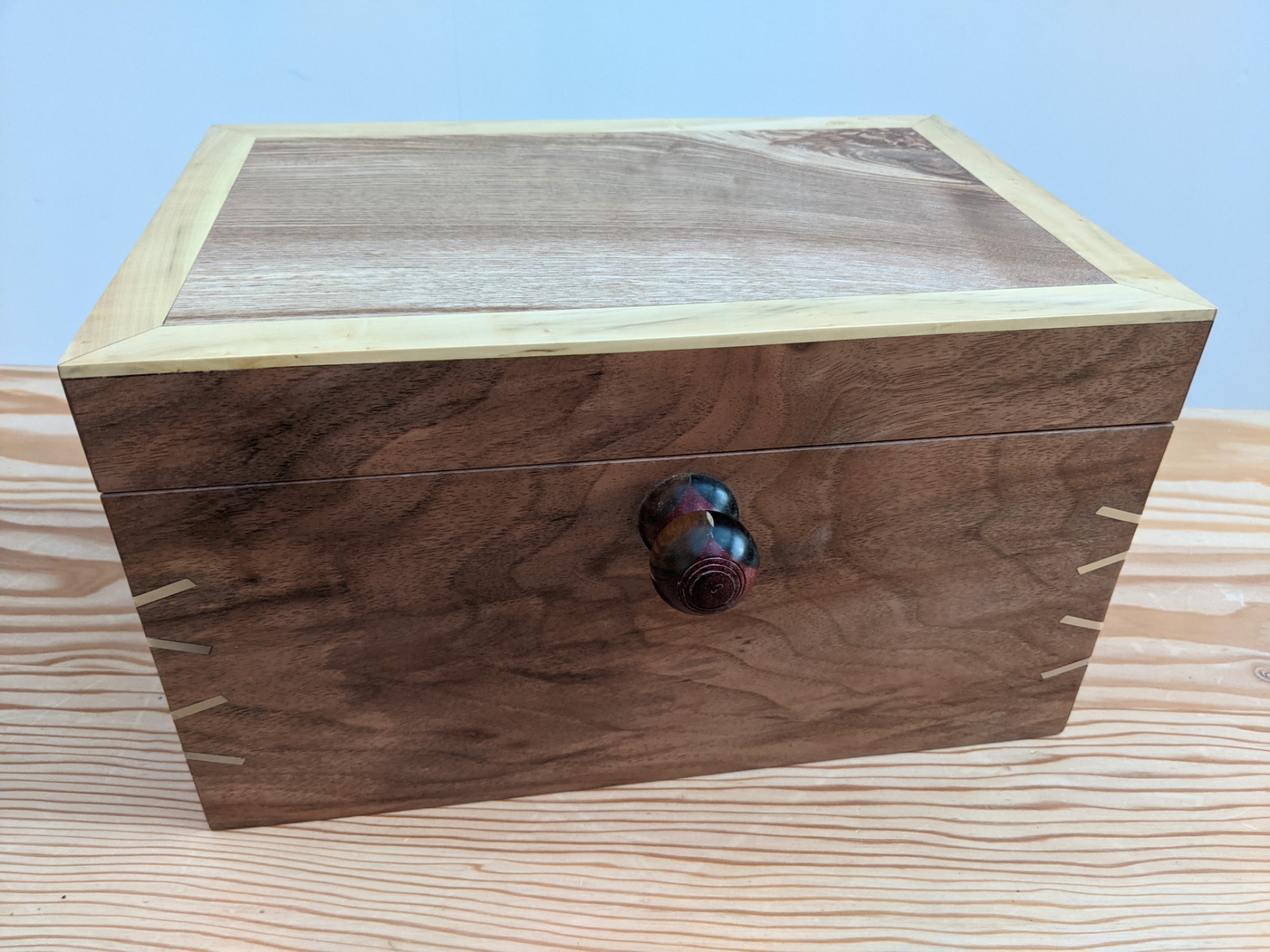 Description: Splines cut from brass plate, and the knob is a re-used tang from a goblet. It was chance that I had some brass the same width as my saw blade, otherwise I might not have attempted this