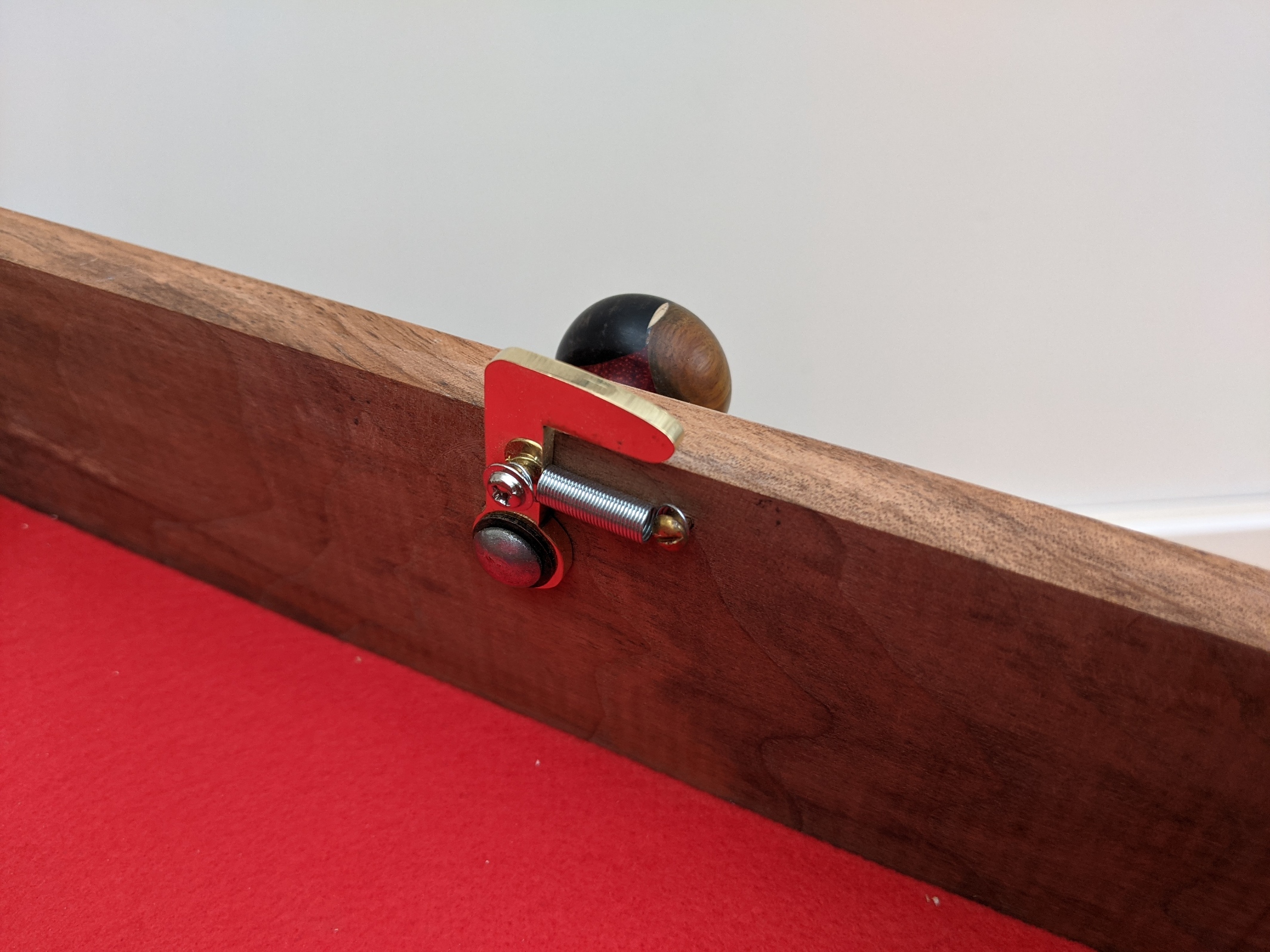 Cut from solid brass, the hook socket is filed square to fit over a coach screw with square shoulder; the knob was then screwed onto the protruding bolt until the small remaining white sliver of wood in the knob faced upwards. Turning it is quite stiff, and as yet the spring doesn't return the latch to the locking position, but it will get looser over time