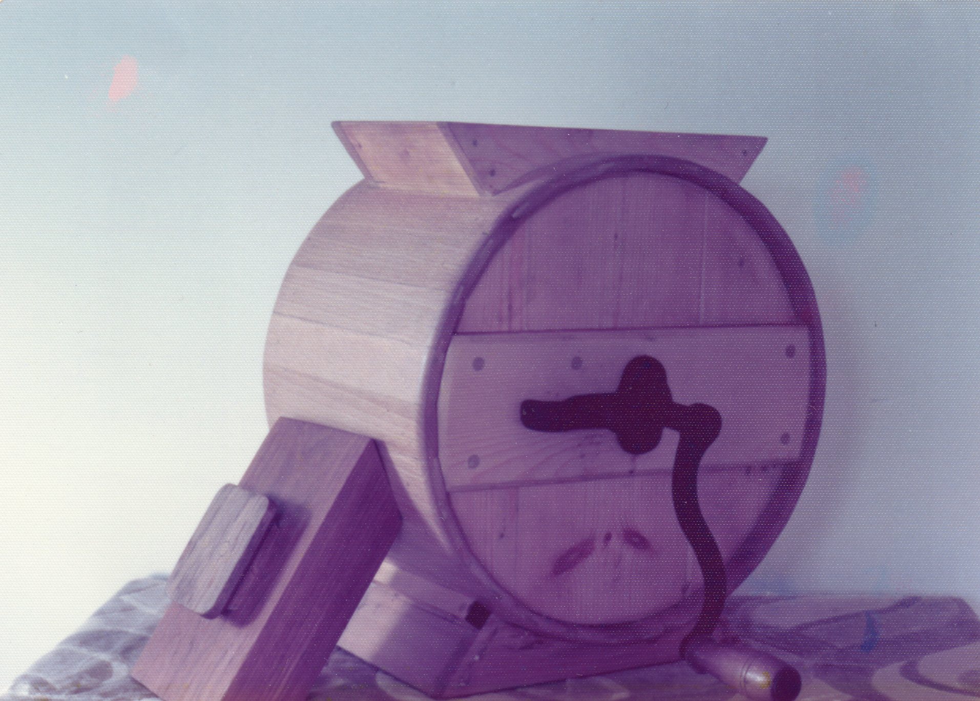 The metal fittings were all that remained of this churn which was left on the farm; the wooden parts, infested with woodworm, more or less crumbled to dust when touched. I was able to measure up and remake them, using beech, and teak for the lid