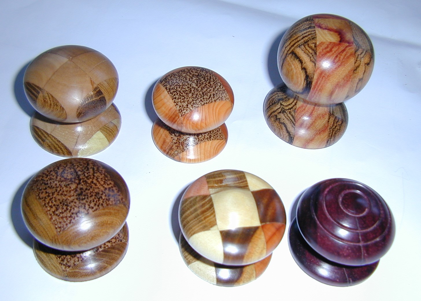 Made from the base stubs ('tangs') of goblets - the bits that are held in the chuck - in order not to waste the beautiful woods