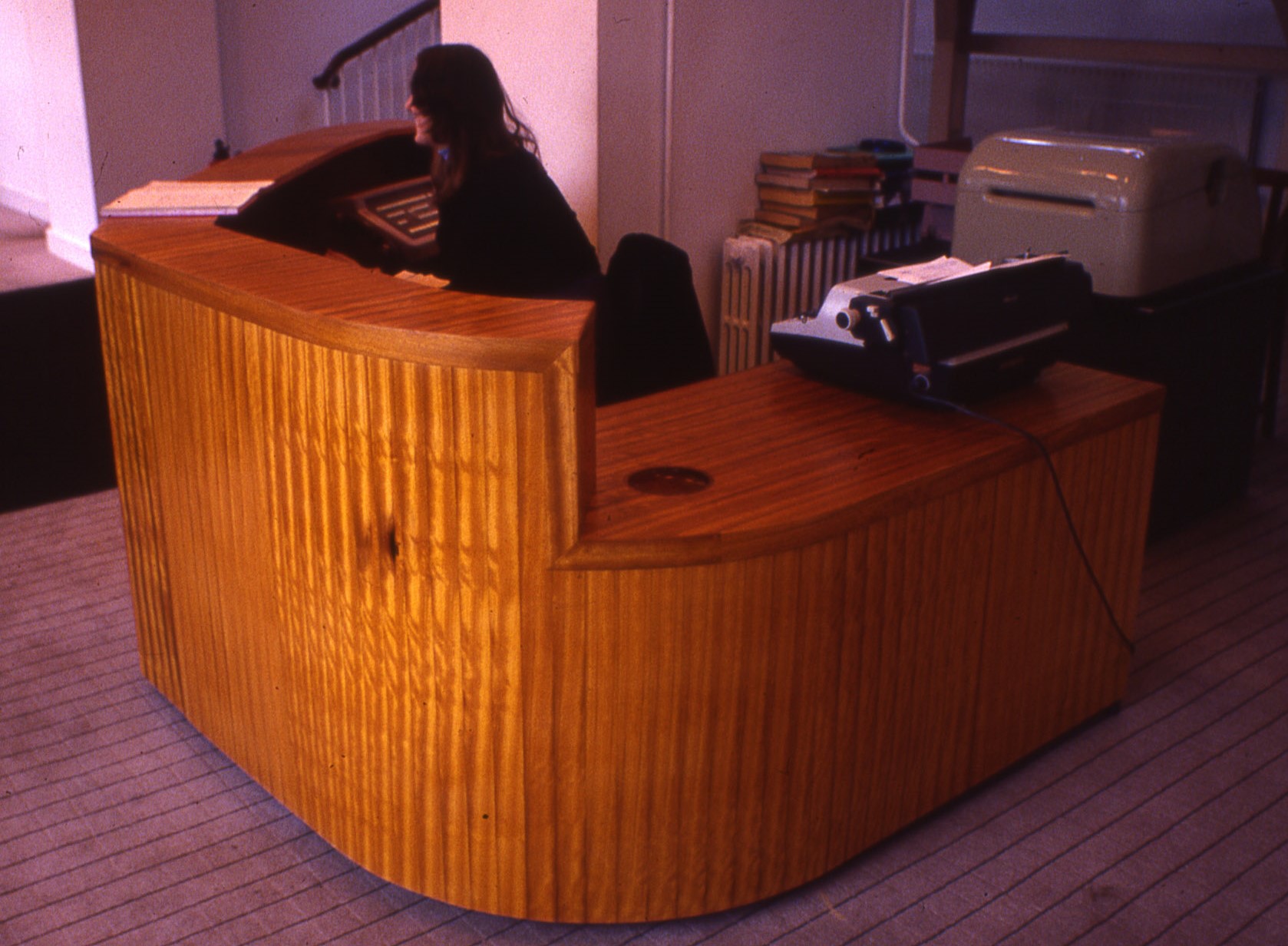 Made of strips of Iroko, like the stair treads of the staircase behind. Iroko is hard to cut and the resin burns onto a circular saw blade creating a choking smoke, but I did remember to keep and fix the strips in order so that the grain matched, and the chatoyancy shows up ok. Susan, the receptionist at the desk, was in charge of the Telex machine (remember them?) - the bulbous plastic lump in the right background. Let into the desk to hold paperclips and the like is half a teak salad bowl from Parsons Restaurant, now Sophie's Bar. My first workshop was in the Mews behind it