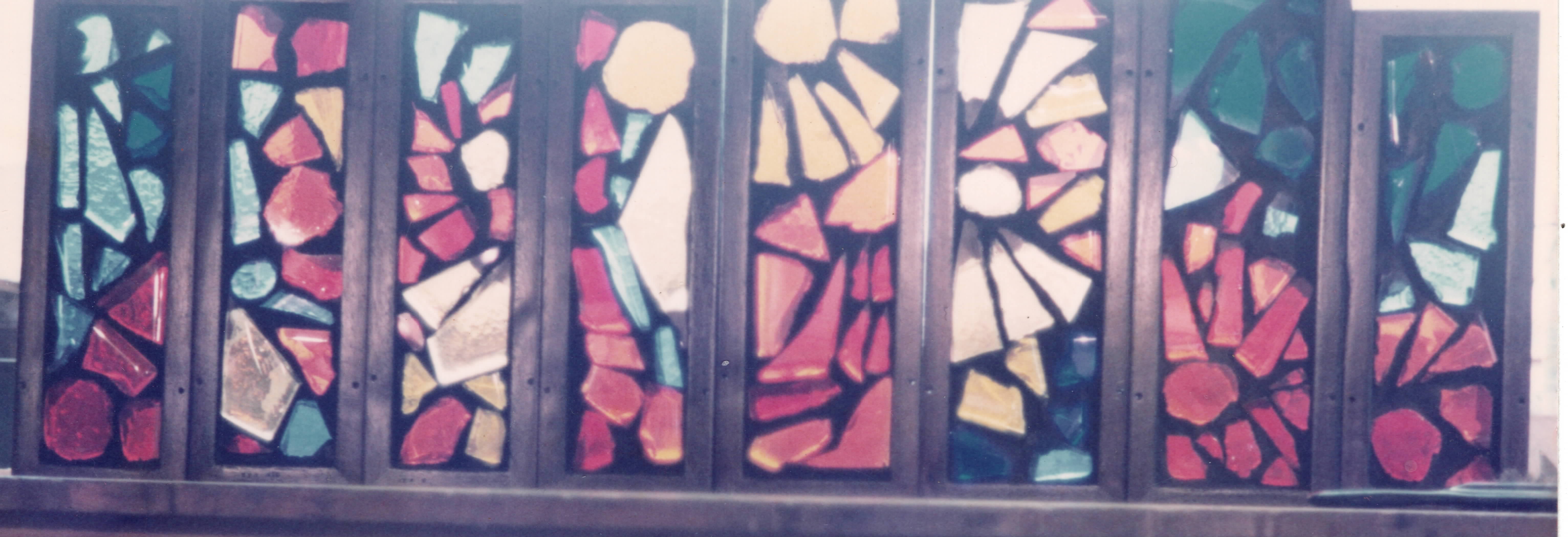 There were seven slits (originally for allowing air to enter to dry the hay) in our converted stone barn in the Peak District. This is the set of seven slab glass (dalles de verre) panels set in concrete to solve the problem of how to glaze the slits, using the theme of the sun and moon changing places in the sky over the course of a day. The 200 X 300mm slabs are manufactured by St Gobain in St Juste sur Loire, France. They were broken and shaped with a tungsten-tipped hammer. Dom Charles Norris at Buckfast Abbey was the first person in the UK to become expert in the use of slab glass. I watched him at work and remembered, a couple of decades later, what to do