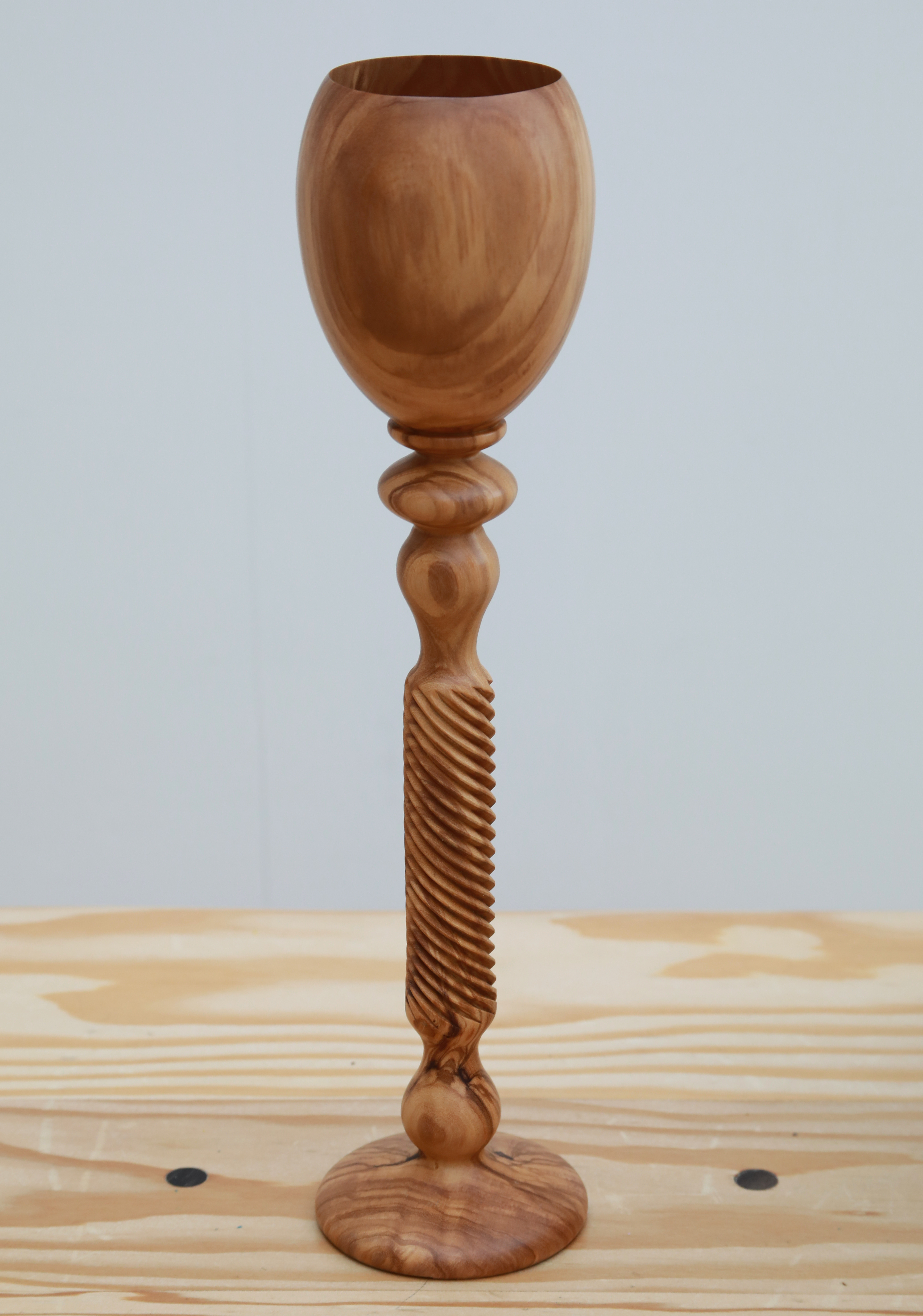 The proportions of this goblet are, I agree, unattractive; I had intended to do a practice run with the excellent Robert Sorby patterning tool on a thickish stem, then rub it out and repeat on the thinner one; but I bottled out. Next time. I think the olivewood is Spanish.