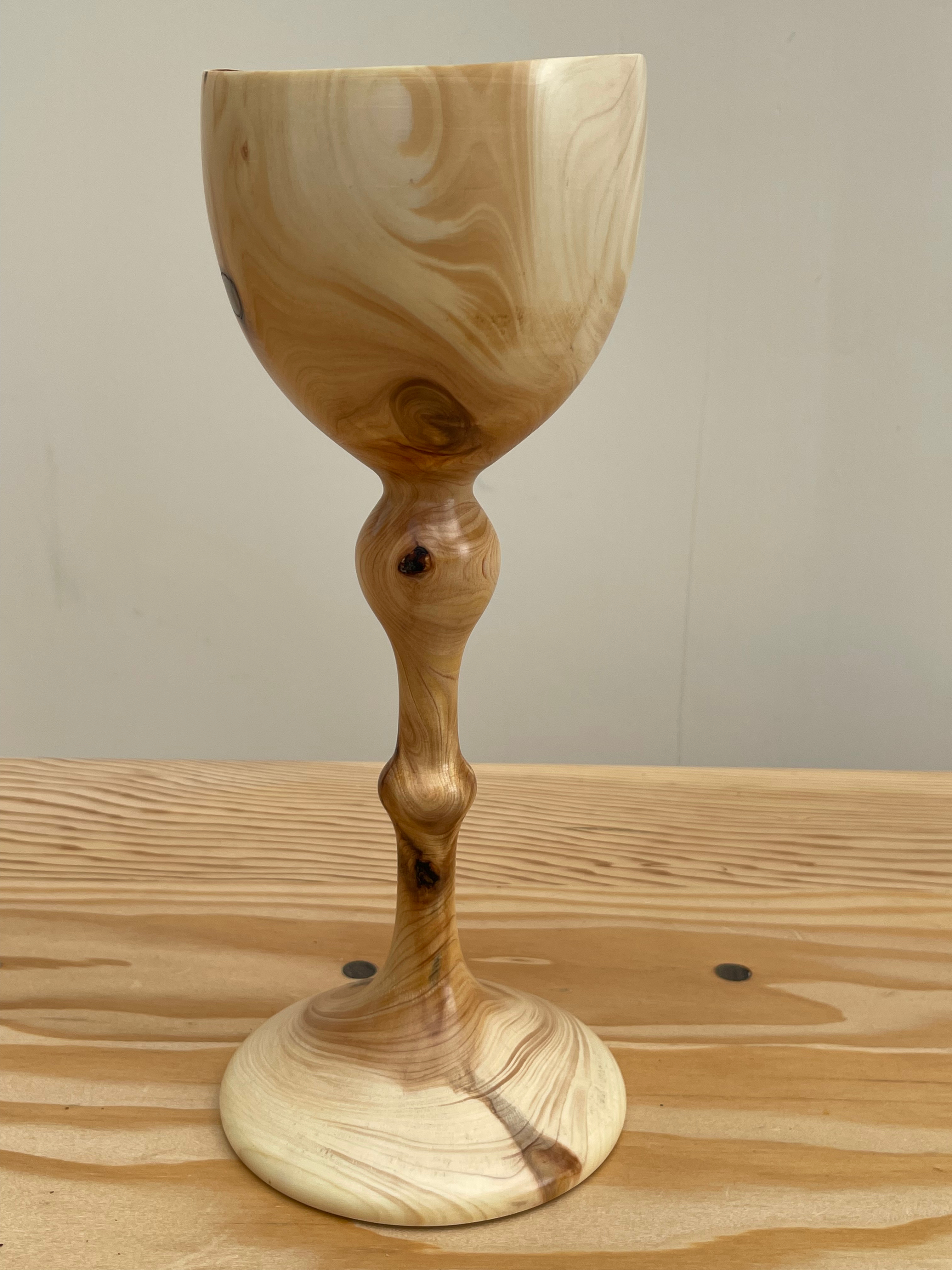 This pine had been sickly for a while (honey fungus), and was in any case too near the ash; but it produced some unexpectedly fine patterns in the grain, and came out well if a little wonky