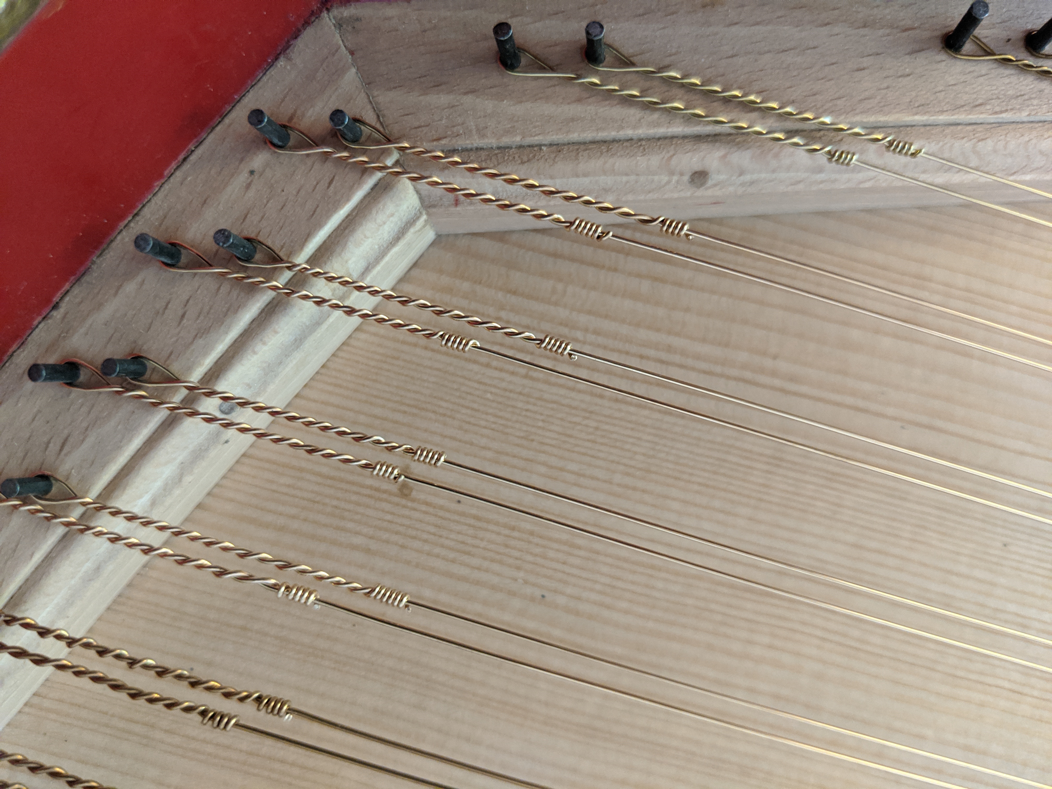 Getting it right. The double helix rounded off by four or five perpendicular turns, and the end cranked off. This is what neat loops should look like, after some assistance from Carey. And they don't slip anymore and cause the instrument to go out of tune