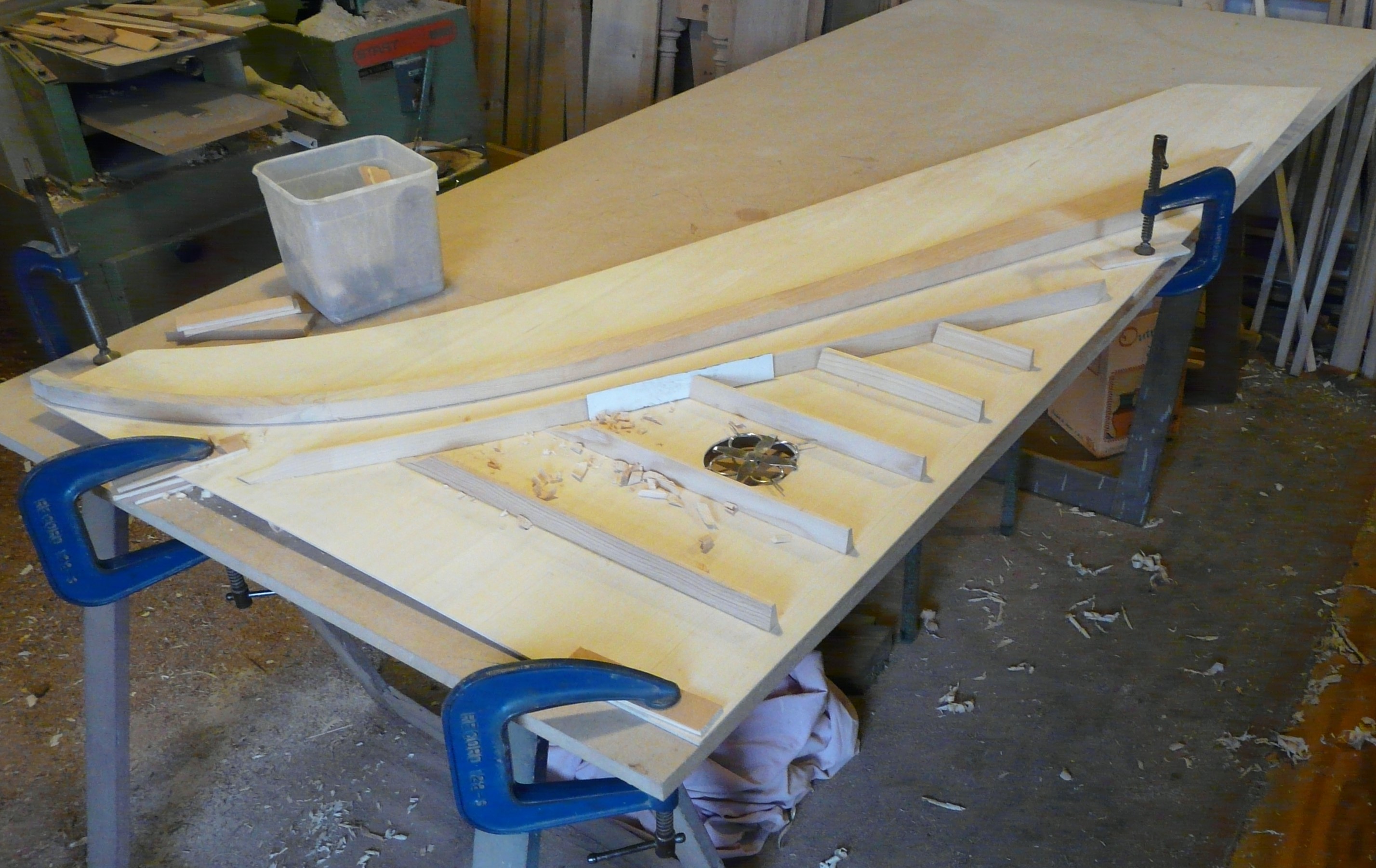 The rose is firmly attached (to stop it from vibrating) by its four arms to the underneath. The soundboard is planed to a 1/16th" taper at the edges, making it very sensitive to the vibrations produced by the strings acting through the bridges. Correct fitting and treatment of the soundboard is vital for acoustical quality.
