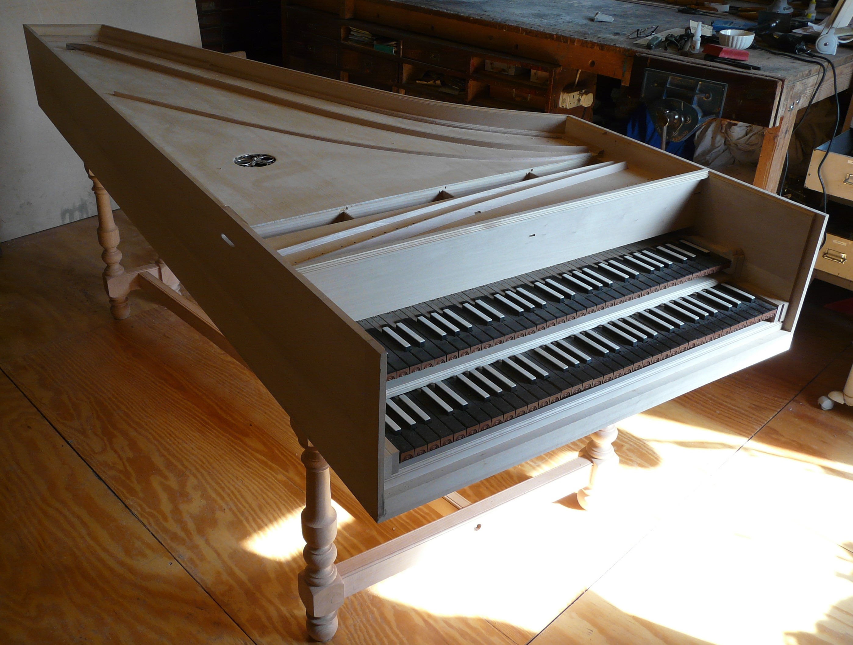 Everything is now ready for stringing and fitting the action; and for making its first sounds before painting and gilding