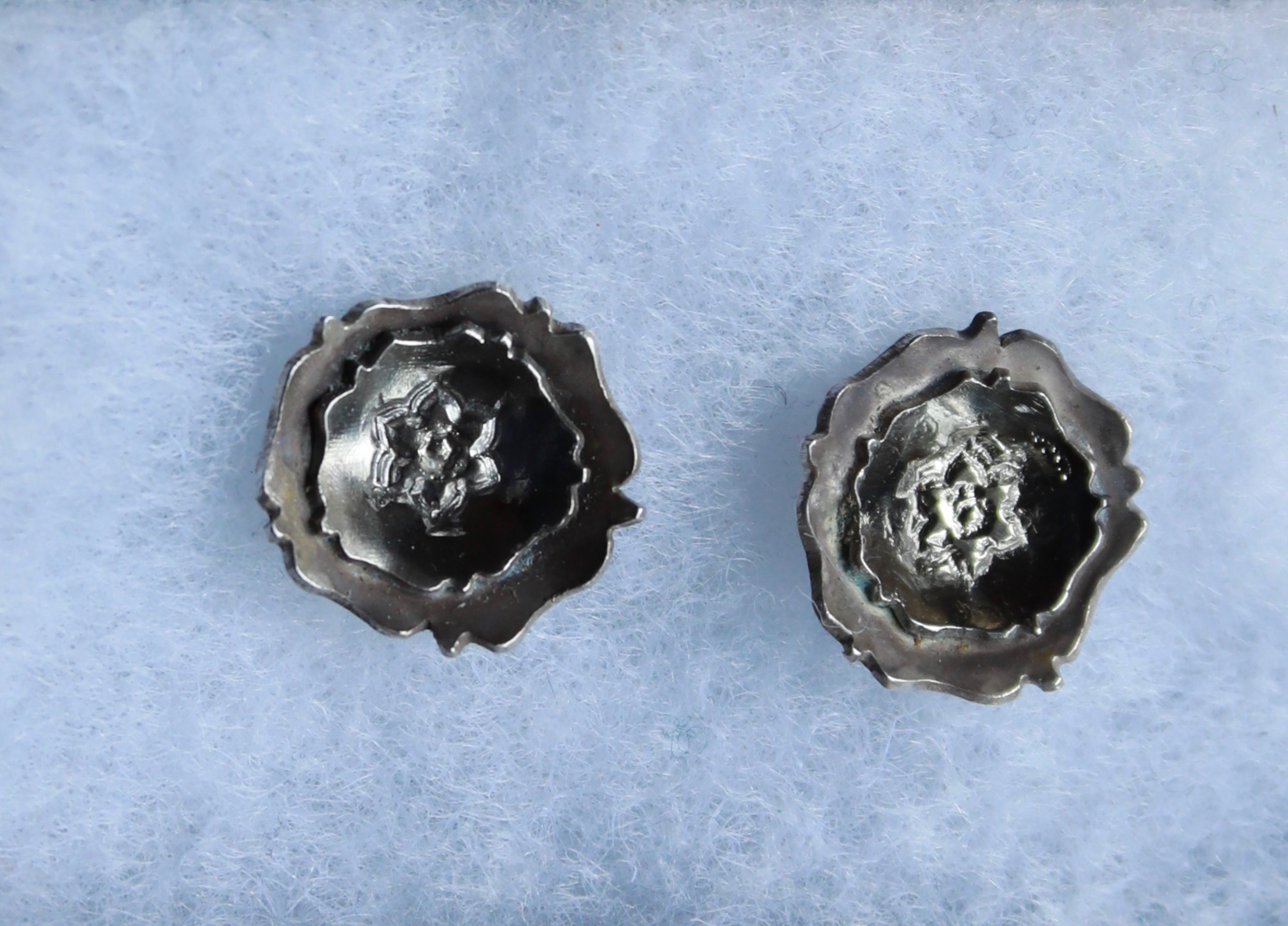 The outer rose shape has been dipped in bleach to make it dark, representing the red rose of Lancaster, while the inner rose is left shiny. It doesn't show well in the photo. Taking photos of silver is a job for a professional, using a light tent, because it is so hard to avoid reflections of the photographer