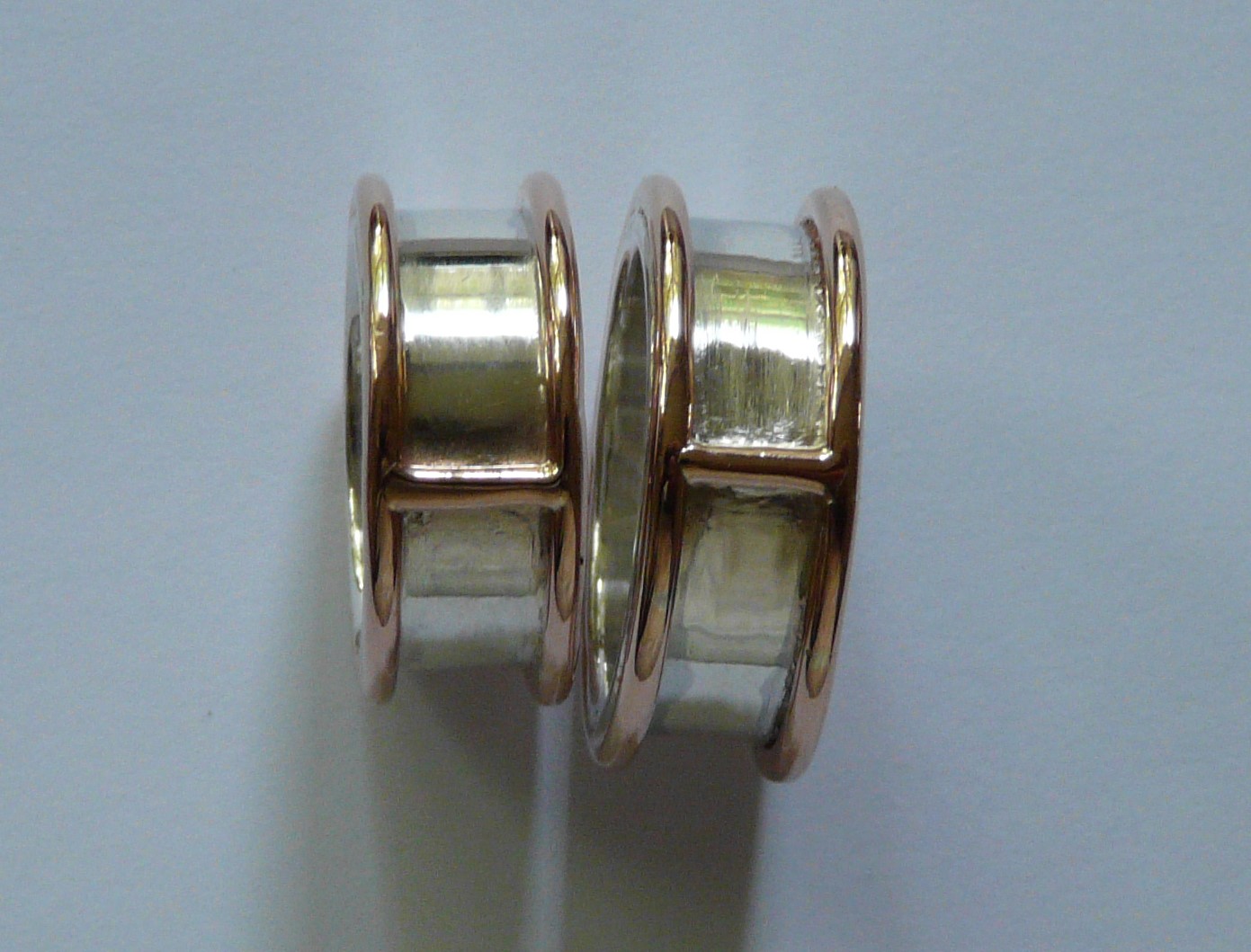 The engagement rings were plain silver bands, to which gold wire was added for the wedding. This was difficult because the gold wire was made up from several pieces of redundant gold chain, and had therefore been soldered before being fused onto the silver; to prevent the risk of the gold falling apart during this process I had to use high melting-point iron wire to bind the gold rings and crosspieces to the silver ring. Jeweller's solder comes in 'easy', 'medium' and 'hard' grades, with the 'hard' having the highest melting point, so if a piece needs to be soldered several times you use 'hard' first, to reduce the risk of melting the solder on the previous joint when performing the next one
