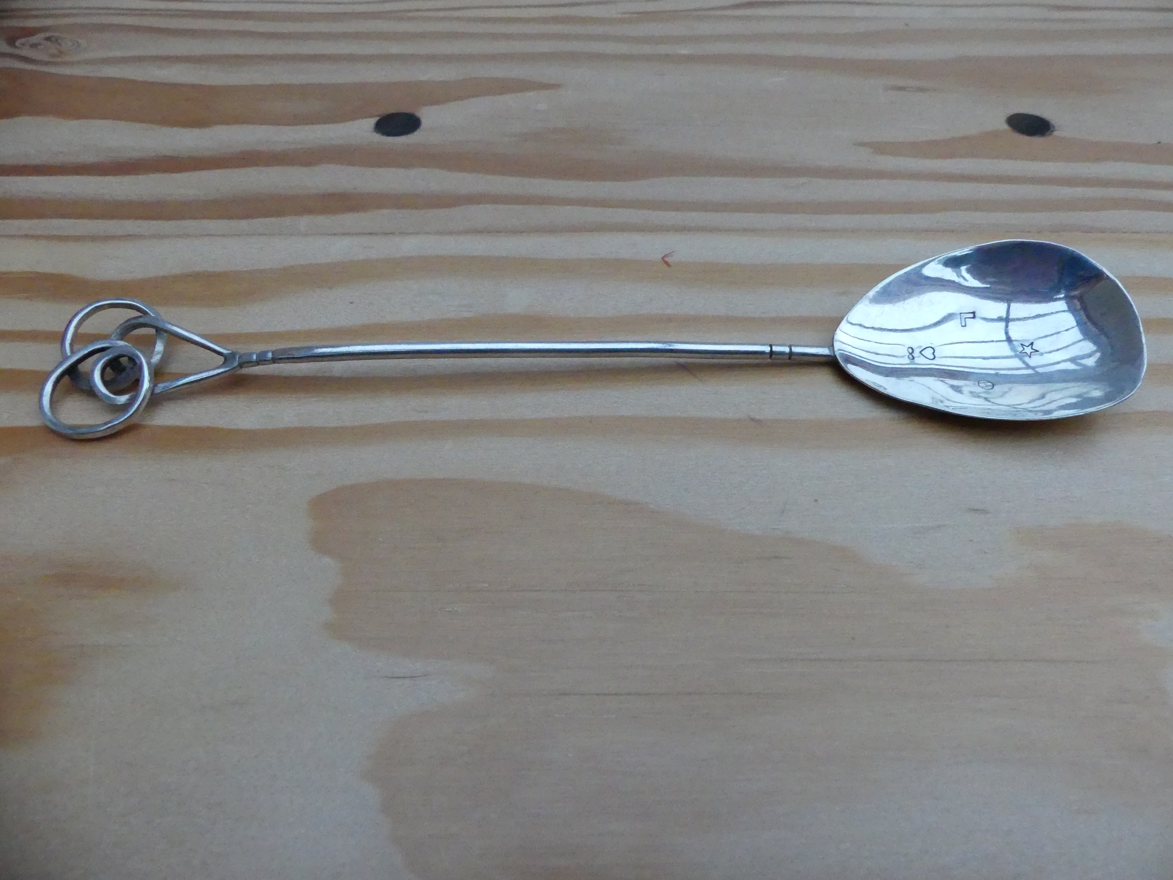 Description: The top is a version of a design in the V&A; the fig-shaped bowl was common in early English silver - there is an excellent example of this in the V&A with a six-sided handle topped with a wild man finial